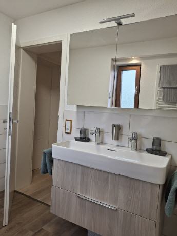 Das Badezimmer verfügt über eine Dusch-Badewanne, ein WC sowie über ein großes Doppel-Waschbecken.