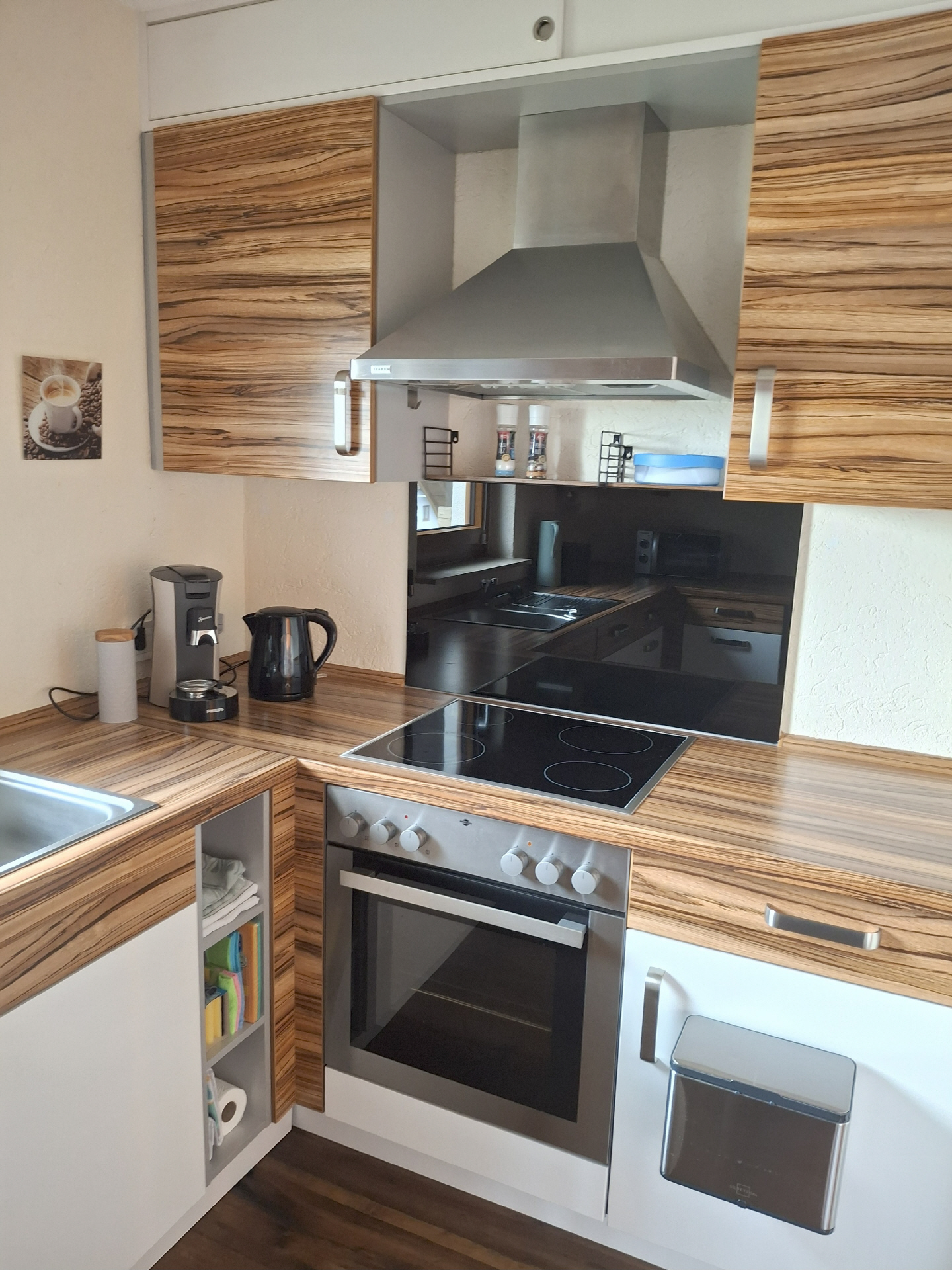 Die Küche ist eingerichtet mit Töpfe, Pfanne, Dosenöffner, Geschirr und Besteck für 6 Personen.