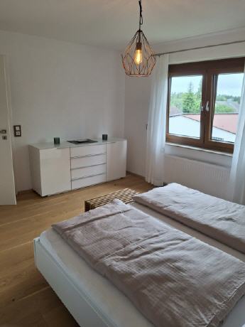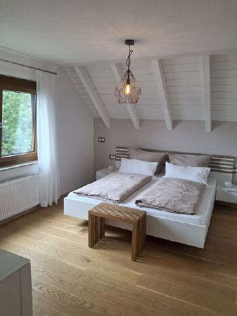 Im gemütlichen Schlafzimmer I befindet sich ein großes Doppelbett (180x200cm) mit zwei Nachttischen, ein offener Kleiderschrank sowie ein Sideboard mit ausreichend Platz